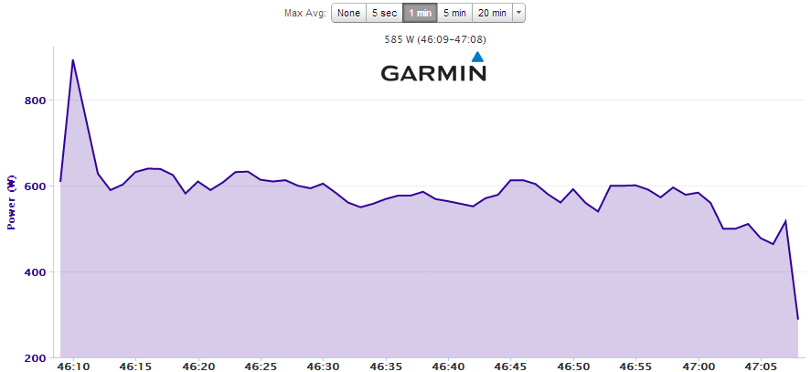 Efter att ha trampat ur benen en stund så smällde jag till med två spurter för att få någon slags maxwatt men jag nådde bara upp till 1132 i max och 1059 under fem sekunder. Rekordet där är 1238/1144.