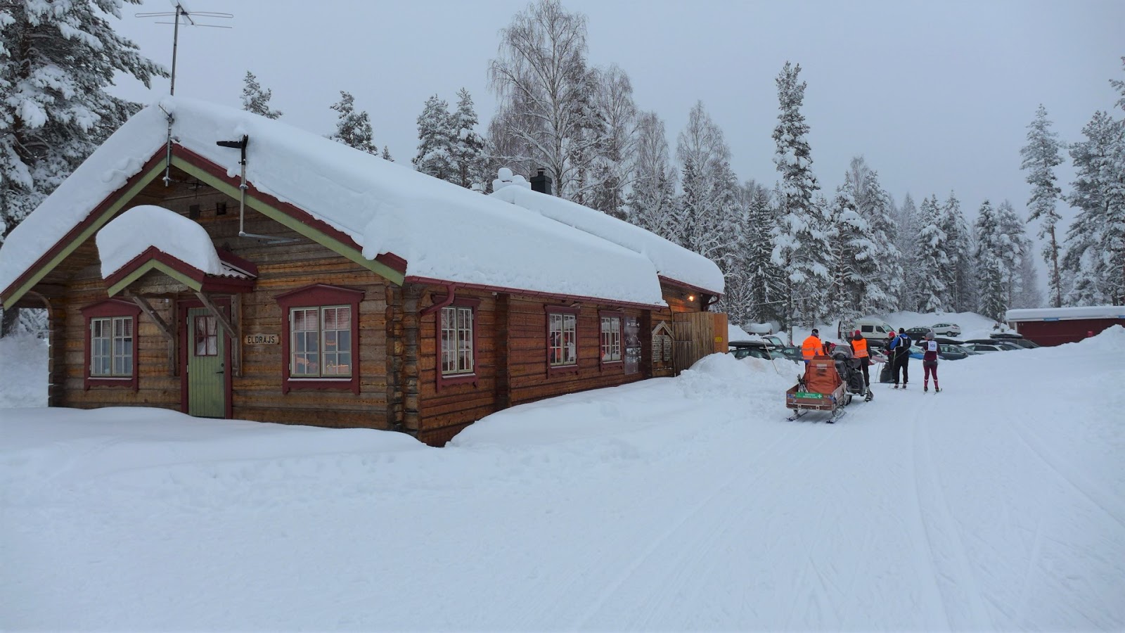 Bilderna ovan visar Linda med kanske 2 kilometer kvar till mål eller så, på toppen av en hyfsad backe. Undrar varför inte den är med på Cykelvasan..? Eller så kändes den bara tuffare på skidor än vad den skulle kännas på cykel kanske. Den andra bilden är från sista kontrollen i Eldris, titta bara så mycket snö det är på taken. Älska snö.